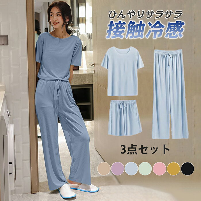 【3点セット】接触冷感 ルームウェア 上下セット 半袖tシャツ 長ズボン 短ズボン 冷感 通気 プレゼント ワイドパンツ レディース メンズ 春夏 パジャマ カットソー パステルカラー かわいい おしゃれ ゆったり 薄手 やわらか 部屋着 寝巻き ナイトウェア トップス