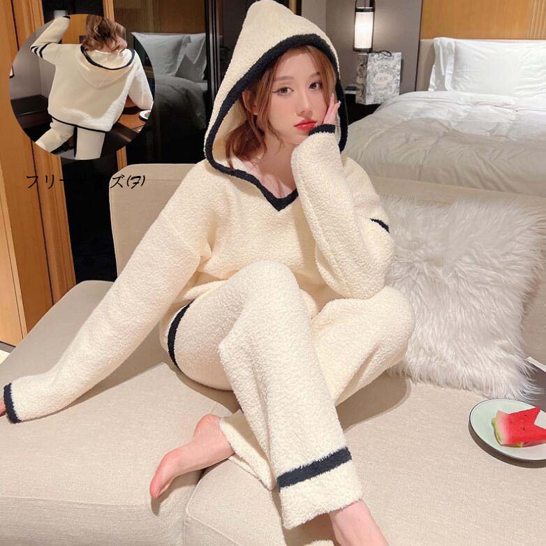 ルームウェア もこもこ パジャマ セットアップ 部屋着 パンツ 寝巻き もこもこ 秋冬 温活 可愛い 防寒 ふわふわ トップス パンツ レディース 部屋着 ニット 部屋着 レディース シンプル ナイトウェア パジャマ 大人 おしゃれ かわいい あったか 長袖 ボーダー ニット POLO襟