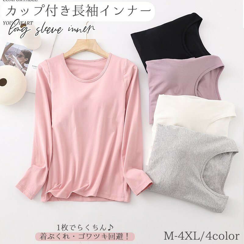 Tシャツ 女性 レディース インナー 長袖 カップ付き ルームウェア 肌着 ブラトップ 長袖インナー 締め付けない カットソー 肌着 下着 トップス 部屋着 寝巻き 無地 アンダーウエア ストレッチ 伸縮性 トップス 春 秋