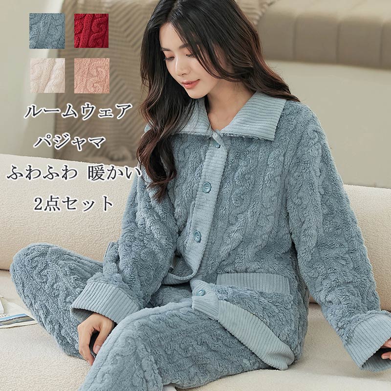 パジャマ ルームウェア レディース 冬 セットアップ 長袖 襟付き ポケット付き 上下セット 2点セット 前開き フランネル トップス パンツ もこもこ 可愛い ナイトウェア 部屋着 寝巻 暖かい あったか 長ズボン リラックス モコモコ ロングパンツ 防寒 厚手 冬物 送料無料