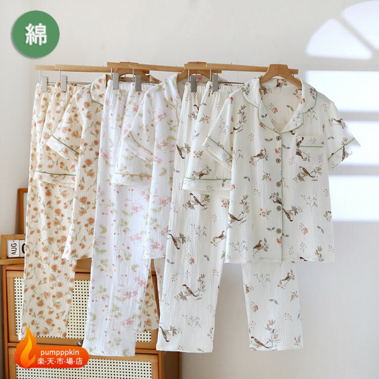 上下3点セット ダブルガーゼ パジャマ 綿 レディース 快適な クレープ ルームウェア 半袖 薄手 パジャマ 春 夏 秋 大人用 かわいい 前開き 部屋着 寝巻き 可愛い 寝間着 ナイトウェア 半袖トップス+半ズボン+長ズボン プレゼント ベージュ ホワイト M L XL