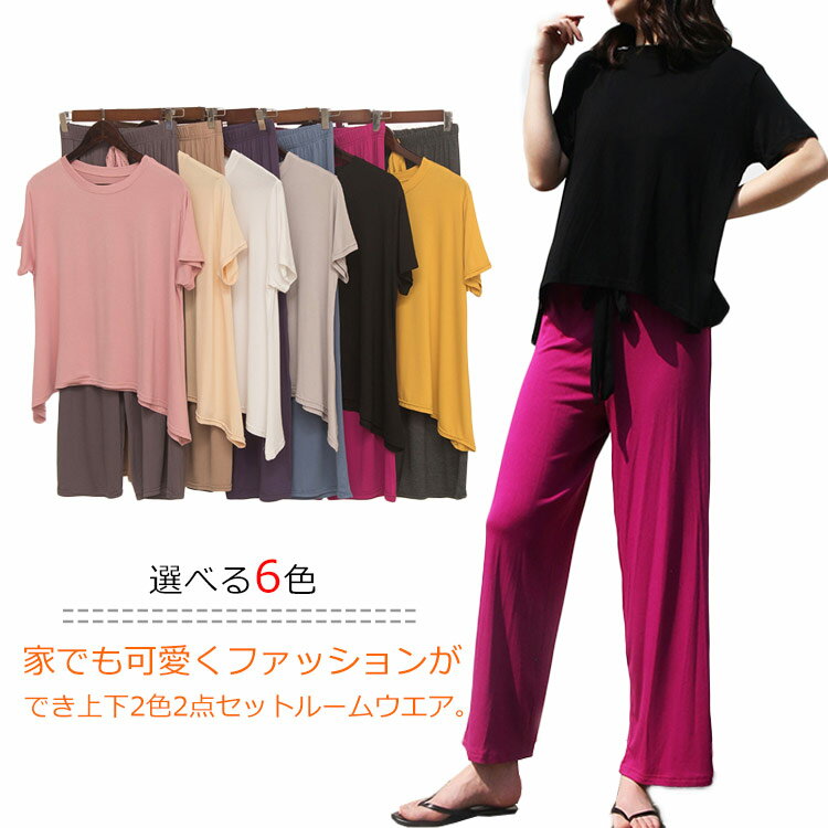 ルームウエア レディース パジャマ ナイトウエア 寝間着 部屋着 2点セット 上下セット セットアップ 上下2色 ゆったり 送料無料 トップス 半袖 ズボン ワイドパンツ リラックス モダール 自宅ワーク 在宅勤務 カットソー 無地 婦人 可愛い ギフト プレゼント