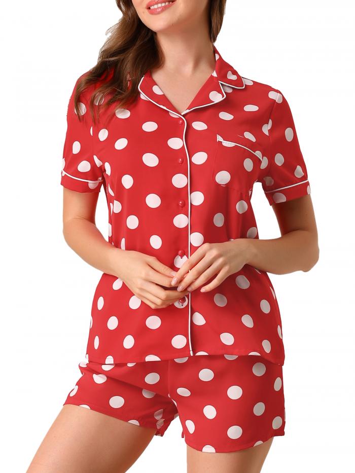 Allegra K パジャマ 上下セット 水玉 半袖 トップス ショートパンツ ルームウェア 部屋着 夏 レディース レッド L