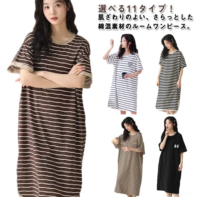 パジャマ 涼しい ワンピース ルームウェア ボーダー柄 半袖 綿混 薄手 夏 レディース 部屋着 可愛い 春夏 ルームワンピース 柔らかい 寝巻き ナイトウェア トップス ロング丈 ゆったり カジュアル 送料無料