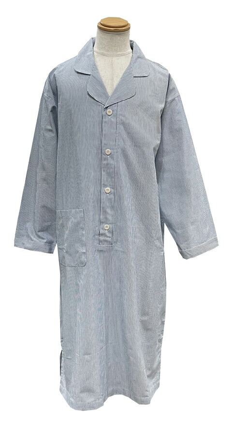 部屋着、寝間着、くつろぎ着、ルームウエアとしてお使いいただけます。 着丈 119cm 身巾 68cm 袖丈 54cm 生地:ポリエステル/綿 スタンダードなシャツ柄ガウン 細いストライプ ブルー×白。お部屋でのくつろぎ時間に色を添えてくれます。ゆったりとしたルームウェア。おくつろぎに。