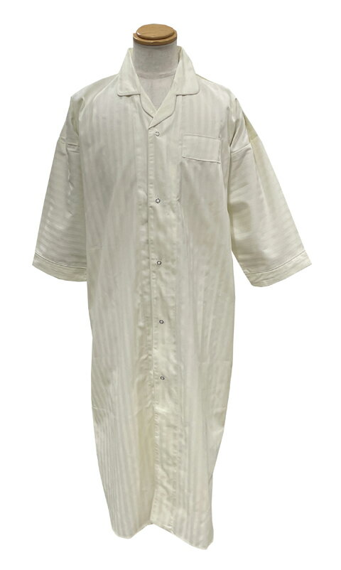 部屋着、寝間着、くつろぎ着、ルームウエアとしてお使いいただけます。 訳あり:胸元に刺繍隠し 着丈 124cm 身巾 70cm 袖丈 36cm 生地:ポリエステル/綿 スタンダードなシャツ柄ガウン 1cmストライプ 落ち着けるクリームカラー お部屋でのくつろぎ時間に