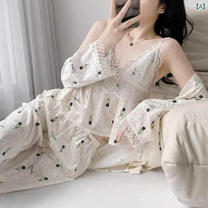 レディース ルームウェア かわいい 春秋冬 女性用 魅惑的 パジャマ 小さい 花柄の ゴールド ベルベット 胸 パッド サスペンダー ズボン ナイトガウン 3点 セット ホームウェア