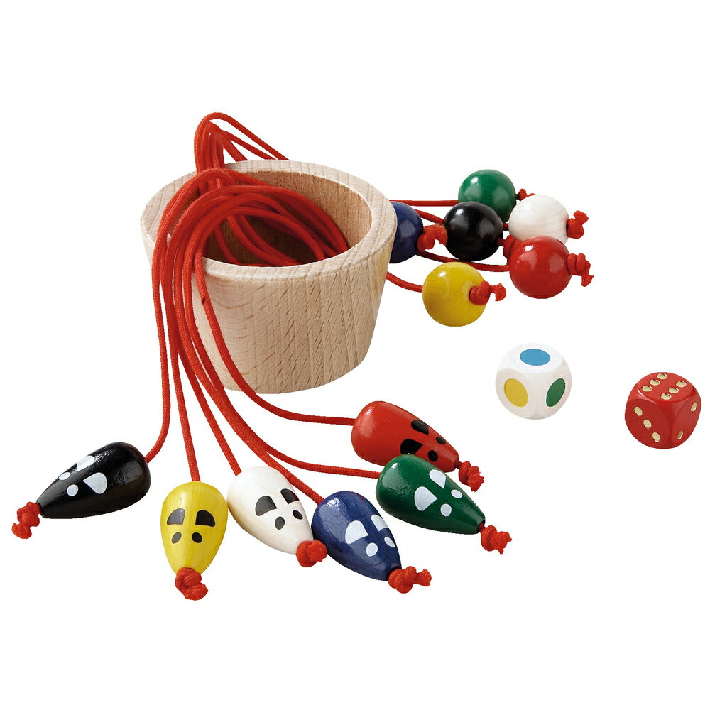 ☆ご注文の数量や、ご希望のお届け日によっては、ご希望に添えない場合がございます。 数量が多い場合や、お急ぎの場合は事前にお問合わせ下さい。 商 品 仕 様 メーカー ハバ社(ドイツ) 対象年齢 4歳頃〜 参加人数 2〜7人 素材 木製、紐 内 容 (箱)22×22×4.7cm 木のカップ1個、ねずみ6色各1匹、色サイコロ・数サイコロ各1個 商 品 特 徴 まず、ネコになる人を決めます。 ネコは木のカップでネズミを捕まえる、これが基本の遊び方です。 遊び方1 ・まず数サイコロを振って「キャッチサイン」を決めます。もし『3』がでたらそれがキャッチサイン! ・ネコはネズミを捕まえようとし、ネズミは捕まらないように逃げます。 ・ネズミを中心にして放射線状に置き、ネズミ役の人はひもの先の玉を持ちます。 ・ネコ役の人はサイコロを転がします。 もしも『3』だったら、ネズミは一斉に逃げましょう。ネコはネズミを捕まえます。どのネズミでもOKです。 『3』以外だったら、ネコもネズミもそのままです。 さあお互いに次に振られるサイコロの目に集中しましょう。 遊び方2(幼い子供たちに) ・数サイコロの代わりに色サイコロを使って遊びましょう。 ・何色をキャッチサインにするかを決めて、遊び方1と同じように進めます。 ・色サイコロと同じ色のネズミを捕まえましょう。 他の色のネズミを捕まえたり、違う色のネズミが逃げ出したりしないよう、気を付けて!HABA キャッチミー メーカー ハバ社(ドイツ) 対象年齢 4歳頃〜 素材 木製 紐 内容 木のカップ1個、ねずみ6色各1匹、色サイコロ・数サイコロ各1個 ゲームルール まず、ネコになる人を決めます。 ネコは木のカップでネズミを捕まえる、これが基本の遊び方です。 遊び方1 ・まず数サイコロを振って「キャッチサイン」を決めます。もし『3』がでたらそれがキャッチサイン! ・ネコはネズミを捕まえようとし、ネズミは捕まらないように逃げます。 ・ネズミを中心にして放射線状に置き、ネズミ役の人はひもの先の玉を持ちます。 ・ネコ役の人はサイコロを転がします。 もしも『3』だったら、ネズミは一斉に逃げましょう。ネコはネズミを捕まえます。どのネズミでもOKです。 『3』以外だったら、ネコもネズミもそのままです。 さあお互いに次に振られるサイコロの目に集中しましょう。 遊び方2(幼い子供たちに) ・数サイコロの代わりに色サイコロを使って遊びましょう。 ・何色をキャッチサインにするかを決めて、遊び方1と同じように進めます。 ・色サイコロと同じ色のネズミを捕まえましょう。 他の色のネズミを捕まえたり、違う色のネズミが逃げ出したりしないよう、気を付けて! ※参加人数:2〜7人 ※プレイ時間:約15分
