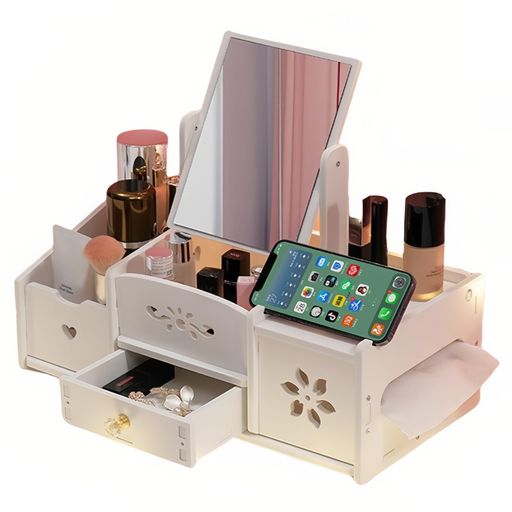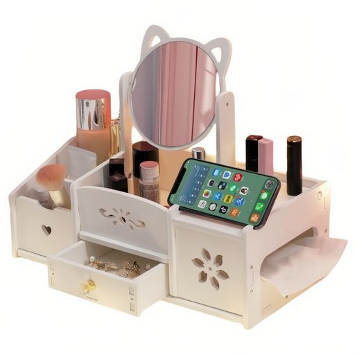 [ミニサイズの可愛いドレッサー]化粧道具や小物入れに使える可愛いミニドレッサーです。シンプルなホワイトカラーで、猫耳や四角デザインのミラーで化粧をお楽しみいただけます。 [コンパクトで置く場所を自由に]コンパクトな見た目ながらも様々なタイプの化粧品を収納できるお洒落ドレッサーです。卓上・棚・デスクに置いても邪魔にならないサイズ感が特徴。本体ごと持ち歩いてお好みの場所でお使いいただけます。 [回転化粧鏡]センター上部には角度調整可能なミラーを完備。その下にはイヤリングや指輪などのアクセサリーが置けるようになっています。下部には引き出しが2段もあるため、パフやメイクスポンジなど埃を避けたいアイテムの収納にピッタリです。 [パーティション化されたストレージ]両サイドには縦に深さのあるスタンドが4ポケット備わっているので、縦型のボトル・チューブ・瓶などを入れておけます。 [簡単なDIY化粧品収納ボックス]環境に優しいPVC素材の複数のパネルから簡単に組み立てられる、DIY卓上収納ボックスボックスです。ほぞ構造とステンレスねじの補強で取り付けも安定し、初心者でも使いやすいです。
