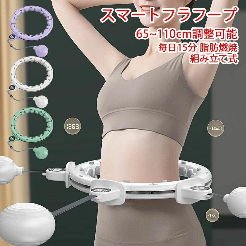 【落ちないスマートフラフープ 】【ウエスト65~110cm調整可能 】落ちないスマートフラフープ【毎日30分の運動で脂肪燃焼効果を実感】スマートフラフープをまわすことにより、腰痛防止や骨盤矯正マッサージなどの効果があり、基礎代謝を高めてくれます。基礎代謝が高まることで脂肪を燃焼させ、インナーマッスルが強化されてキレイなくびれを作ることができます。【大きなスマートカウンターでまわした回数を正確にカウント!】自分で回数をカウントすると、疲れてきたり夢中になってしまうと正確な回数をカウントすることが難しくなってしまいますよね。ですがこちらの商品でしたらスマートカウンターがまわした回数を正確にカウントしてくれますので、自分で回数を数える煩わしさから解放してくれます。【サイズ調整可能で家族全員にフィット】ウエストサイズ(約65〜110cm)に合わせて長さ調整が可能。成長期のお子様から大人まで、家族みんなでご使用いただけます。【落ちにくい&高品質素材】従来のフラフープの回転方法を変更。スマート設計でウエストにしっかりフィットし、運動中に落ちにくいから初心者でも安心。 サイズ S(ウエスト80cmまで対応) M(ウエスト90cmまで対応) L(ウエスト110cmまで対応) サイズについての説明 S(ウエスト80cmまで対応) M(ウエスト90cmまで対応) L(ウエスト110cmまで対応) 【サイズを調整する】・腰に装着して、ご自身のサイズに合わせて調整してください。・余分な部分は取り外すことができ、腰回りにぴったりフィットします。 素材 PC、PTR、PP 色 パープル グリーン ホワイト 備考 ●サイズ詳細等の測り方はスタッフ間で統一、徹底はしておりますが、実寸は商品によって若干の誤差(1cm~3cm )がある場合がございますので、予めご了承ください。 ●製造ロットにより、細部形状の違いや、同色でも色味に多少の誤差が生じます。 ●パッケージは改良のため予告なく仕様を変更する場合があります。 ▼商品の色は、撮影時の光や、お客様のモニターの色具合などにより、実際の商品と異なる場合がございます。あらかじめ、ご了承ください。 ▼生地の特性上、やや匂いが強く感じられるものもございます。数日のご使用や陰干しなどで気になる匂いはほとんど感じられなくなります。 ▼同じ商品でも生産時期により形やサイズ、カラーに多少の誤差が生じる場合もございます。 ▼他店舗でも在庫を共有して販売をしている為、受注後欠品となる場合もございます。予め、ご了承お願い申し上げます。 ▼出荷前に全て検品を行っておりますが、万が一商品に不具合があった場合は、お問い合わせフォームまたはメールよりご連絡頂けます様お願い申し上げます。速やかに対応致しますのでご安心ください。