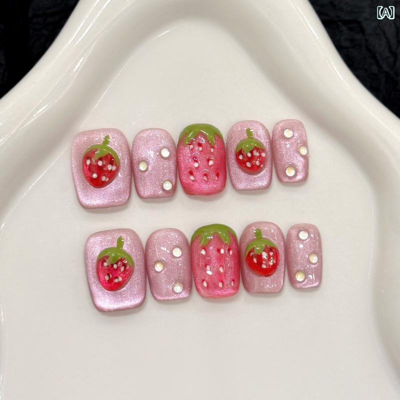 春夏 レディース ネイルチップ 立体 ストロベリー キャッツアイ 手作り ショート アート デザイン かわいい ピンク系 付け爪 着脱式 美甲 アクセサリー