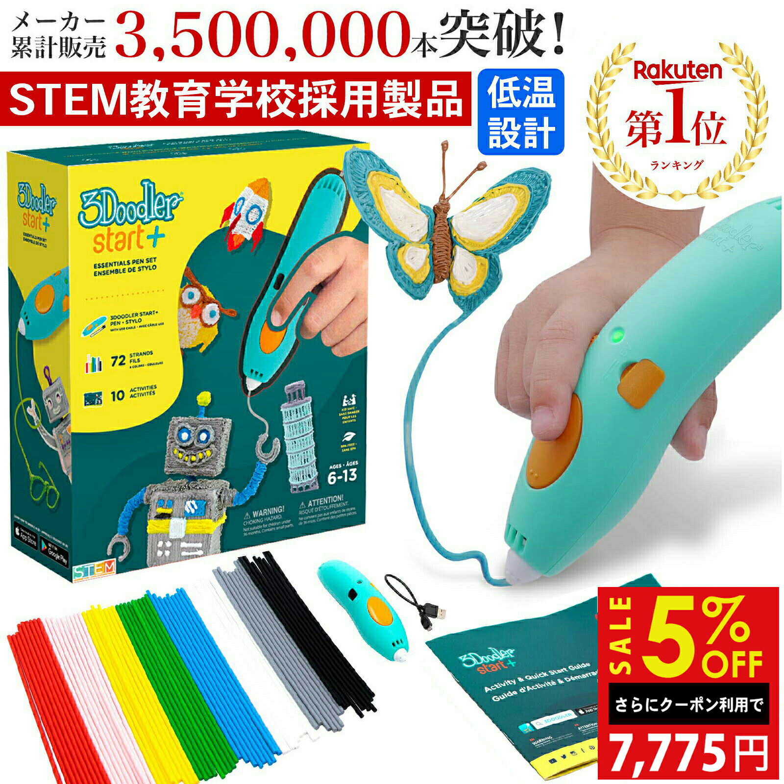 \限定クーポン/【公式 低温設計】3Dペン【世界350万販売】3Doodler Start+ アートペン キッズ 女の子 男の子 誕生日 プレゼント 子供 おもちゃ 知育 玩具 セット 入学祝い 小学生 立体 ペン お絵かき 工作 キット 5歳 6歳 7歳 8歳 9歳 10歳 こども メイキングトイ おすすめ