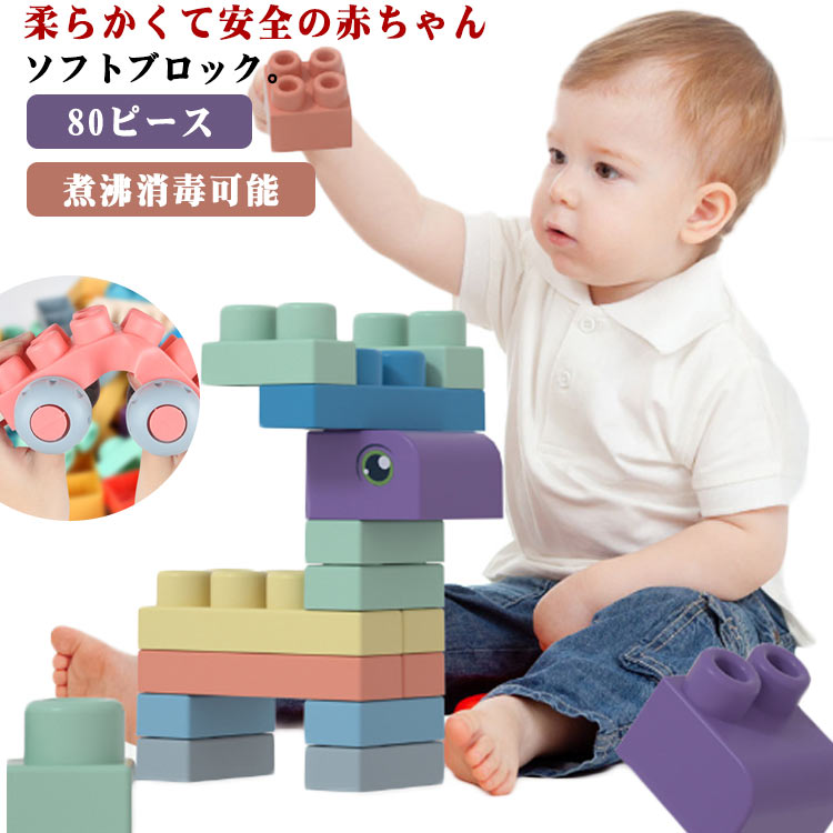 80ピース ソフト ブロック 赤ちゃん 積み木 柔らかいつみき ベビー おもちゃ おおきなブロック 幼児 パズル 早期開発 知育玩具 煮沸消毒可能 なめたりかんだり 男の子 女の子 ブロック遊びのボックス 立体 3D ブロック 知育玩具 知育ブロック