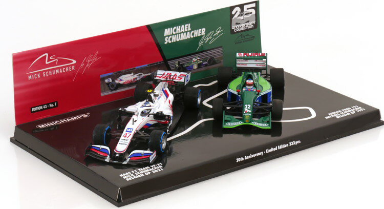 ミニチャンプス 1/43 ハース/ジョーダン シューマッハ 2台セット 30 年 ベルギーGP 1991/2021 Mick & Michael Schumacher 333台限定Minichamps 1:43 Haas/Jordan Schumacher 2 Car Set 30 years GP Belgium 1991/2021 Mick & Michael Schumacher Limited Edition 333 pcs