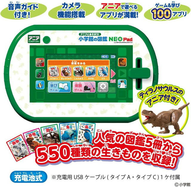 お支払い方法・送料・配送について予約販売商品についてアニアとあそぼう!小学館の図鑑NEOPad (動物 恐竜 おもちゃ 3歳以上)「小学館の図鑑NEO」の人気の5冊から550種の生きものを収録した図鑑パッド! ティラノサウルスのアニア付き!〇ずかん:「小学館の図鑑NEO」の人気の5冊、「動物」「恐竜」「昆虫」「魚」「鳥」から550種の生きもの図鑑を収録!音声読み上げ機能&カメラ機能付き! 写真を撮って図鑑ページに登録ができます。自分だけの図鑑を作ろう!〇ゲーム:遊んで学べるアプリが100アプリ! アニアで遊べるアプリや、非認知能力が鍛えられるアプリもあります。〇カメラ:実物のアニアを撮影してゲームで遊んだりすることができます。ティラノサウルスのアニアが1体付き!タカラトミーACアダプターTYPE5C2(別売)対応。【セット内容】本体(1),充電用USBケーブル(タイプA・タイプC)(1),取扱説明書(1),アニア(ティラノサウルス)(1)■メーカー:タカラトミー(TAKARA TOMY)