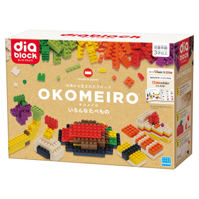 名称 ダイヤブロック OKOMEIRO(オコメイロ) M 内容量 ブロック(7色 計308個) 遊びサポートガイド ブランドブック 申込期日 通年 発送期日 最短3営業日、10日以内に発送(ゴールデンウィーク、お盆、年末年始を除く) ※配送地域、交通事情等により、お届けが前後する場合がございます。あらかじめご了承ください。ダイヤブロック OKOMEIRO(オコメイロ) M 人と環境にやさしい、お米から生まれた新しいダイヤブロック®「OKOMEIRO(オコメイロ)®」誕生!! 食用に適さないお米を原料とする国産バイオマスプラスチック「ライスレジン®」を使用した環境に優しいブロックです。 日本生まれの優しさにふれて、感じてください。 「従来のダイヤブロック」と「OKOMEIROのダイヤブロック」は、素材や形状が異なりますが一緒に遊んでいただけます。 株式会社カワダのラインナップ