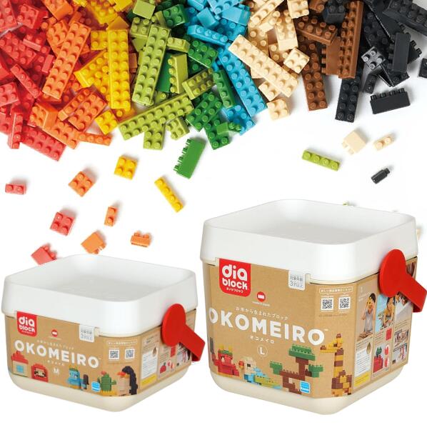 人と環境にやさしい、お米から生まれた新しいダイヤブロック「OKOMEIRO(オコメイロ)」誕生 ■食用に適さないお米を原料とする国産バイオマスプラスチック「ライスレジン®」を使用した環境に優しいブロックです。 ■ブロックの角に丸みをつけたことで、子どもの力でも外しやすく、より組み立てやすくなりました。 ■容器はお片付けをサポートできる形状になっており、フタの裏側にはブロックをはめることもできます。また、リビングになじむよう、外装は取り外しが可能です。 ■こちらの商品の売上金の一部は、こども食堂支援のための寄付金に充てられます。 ■サイズ Мサイズ/Lサイズ ・OKOMEIRO M パッケージのサイズ(W×H×D)280×190×270 (mm) ピース数 7色 / 308ピース 対象年齢 3才以上 【セット内容】ブロック(7色 計308個)、遊びサポートガイド 、ブランドブック ・OKOMEIRO L パッケージのサイズ(W×H×D) 280×260×270 (mm) ピース数 9色 / 672ピース 対象年齢 3才以上 【セット内容】ブロック(9色 計672個)、遊びサポートガイド 、ブランドブック ■ダイヤブロックをご利用いただいているお客様へ 「従来のダイヤブロック」と「OKOMEIROのダイヤブロック」は、素材や形状が異なりますが一緒に遊んでいただけます。