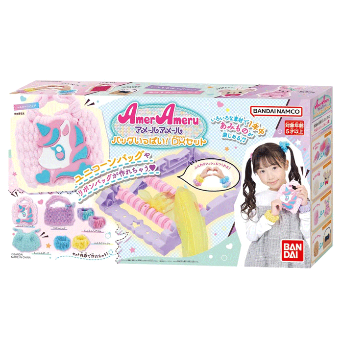 バンダイ アメールアメール バッグいっぱい! DXセット BANDAI 編み物 メイキング 手作り おもちゃ 女の子 プレゼント "いろいろな素材で簡単にあみものが楽しめるメイキングトイ「アメールアメール」よりバッグやシュシュがたくさん作れるDXセットが登場!!毛糸はもちろん、毛糸以外の素材を使ってあみものが楽しめます。セット内容のオーガンジーリボンを使って、本体にヘアゴムをセットし、リボンをヘアゴムに編んでいけばふんわりシュシュの完成!セット内容でバッグ×2種・ポーチ・シュシュ×2種・ヘアゴム×2種の合計7種のアイテムが作れるボリュームたっぷりの商品です。市販の素材を使えば、更にオールシーズンいろいろなあみものを作って遊べます。[セット内容]・本体・・・1個・バー・・・2本・シャトル・・・1本・コーム・・・1個・ボンボン用パーツ・・・1個・仕上げ針/とじ針・・・各1本・オーガンジーリボン(リボンバック用)・・・2色×各1束・オーガンジーリボン(ふんわりシュシュ用)・・・2色×各1束・ゴム紐・・・4色×各3本・平ゴム・・・3色×各8本・モールヤーン(ユニコーンバック用)・・・1束・毛糸・・・1束・モールヤーン(もふもふヘアゴム用)・・・2色×各1束・EVAシール・・・3色×各1枚・ループエンド・・・2個・取扱説明書・・・1枚 5