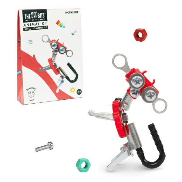 ボルト・ナット・電気部品などのパーツを組み立て、さるをつくるDIYキットです。目や口となるパーツの角度を少し変えるだけで表情が変わり、自分だけの特別な作品が完成します。作品はSNSでシェア!1個つくったら仲間をどんどん増やしオフビッツの世界を広げよう。●オフビッツとは?ボルトやナットの機械部品をモチーフにしたパーツを自分の手を使い組み立てながら、動物・ロボット・乗り物をつくるDIYキット全8種(「3in1シリーズ」は同じパーツで3つの作品がつくれます)。動かして遊ぶなかでモチーフの表情や感情があるように見え、自然に愛着がわきます。●新しいアート&クラフトで「サステナブルな体験」SDGs の観点から、廃棄物や不用品など本来捨てるものに、デザインやアイデアを持たせて別のものに生まれ変わらせる「アップサイクル」に注目が集まっています。遊びながら、ボルトやナットのようなパーツもあそび道具になりえることに気づき、つくる人で完成形が変わる楽しさ、身近な物を再利用して創り出すサステナブルな発想力を育むことにもつながります。オフビッツ社ケーブルやクランプなどの電気工事に使用されるパーツをアートにしたRoyBarazani氏が、「ガラクタのようなパーツから自由に創作する」という思想からあそび道具を考案。ボルトやナットのような部品もあそび道具になりえることに気づき、完成したものを作り変えたり、同じものから違うものを作ったり。商品の背景には、ニューヨークやパリで長くトレンドのDIYやリサイクルなどサステナブルな精神が宿っています。