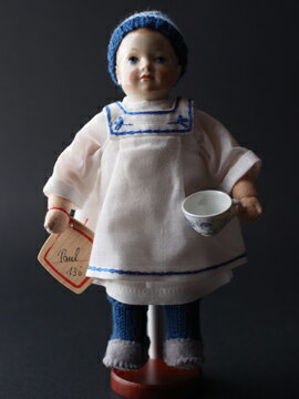 マイセン&ケテ・クルーゼ(ドイツ) H:20cm ドイツの磁器メーカー・マイセンと、同じくドイツの人形メーカー・ケテクルーゼが共同企画した限定生産の人形です。ドイツの名窯・国立マイセン磁器製作所は2010年に300周年を迎えました。また、同年はケテ・クルーゼ社の創始者ケテ・クルーゼ夫人が本格的に人形製作を始めてから100年目にあたります。そこで両社が記念企画として、共同で人形を製作しました。このPaulはマイセンのJulius Konrad Hentschel(1872-1907)の作品「ブルーオニオンのカップを持った男の子のシリーズ」をもとにつくられました。人形の胴体はケテ・クルーゼ製。骨組みはワイヤー、その周りにはやわらかいコットンが詰められており、表地にはジャージ素材が使われています。頭部はマイセンにて特別に作られ、手作業で彩色されています。白いエプロンは青い糸で丁寧に手刺繍され、帽子と靴下は手編みのニット、グレーの靴はフェルトでできています。そして手には特別に作られたマイセンの象徴である《ブルーオニオン》のミニチュアカップを持っています。世界限定300体シリアルナンバー入