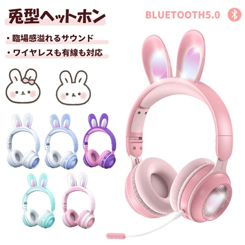 ヘッドホン 子供 兎耳ヘッドホン マイク付き Bluetooth5.0 通話対応 うさぎ耳 ワイヤレス ヘッドフォン 子供用 大人用 有線&無線兼用 オーバーイヤー 折りたたみ式 ゲーミングヘッドセット 高音質 LEDライト 密閉型 ヘッドセット iPhone13 iPad PC