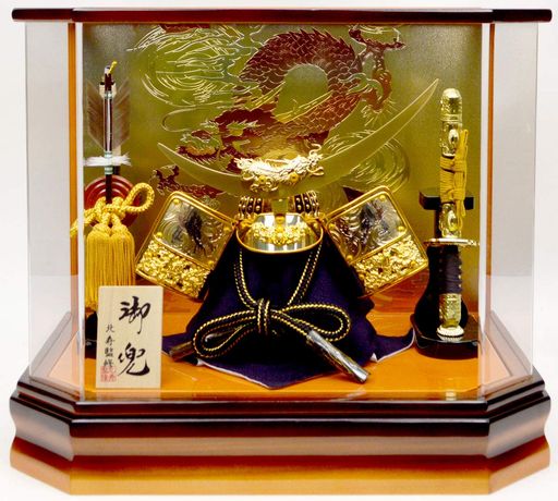 サイズ:幅43x奥行き29x高さ37cm ケース:六角カブセ型タイプ 材質:木製・樹脂(アクリル) 背板:色彩箔竜柄※アルミ板を型押し色付け 兜:伊達政宗黒塗り金筋鉢 鍬形:金竜付三日月型 仕様:彫金双竜吹き返し・金鍍金小札黒縅 忍緒:黒糸に金糸編み 袱紗:紫 弓太刀:木製弓1本矢・金鍍金陣太刀