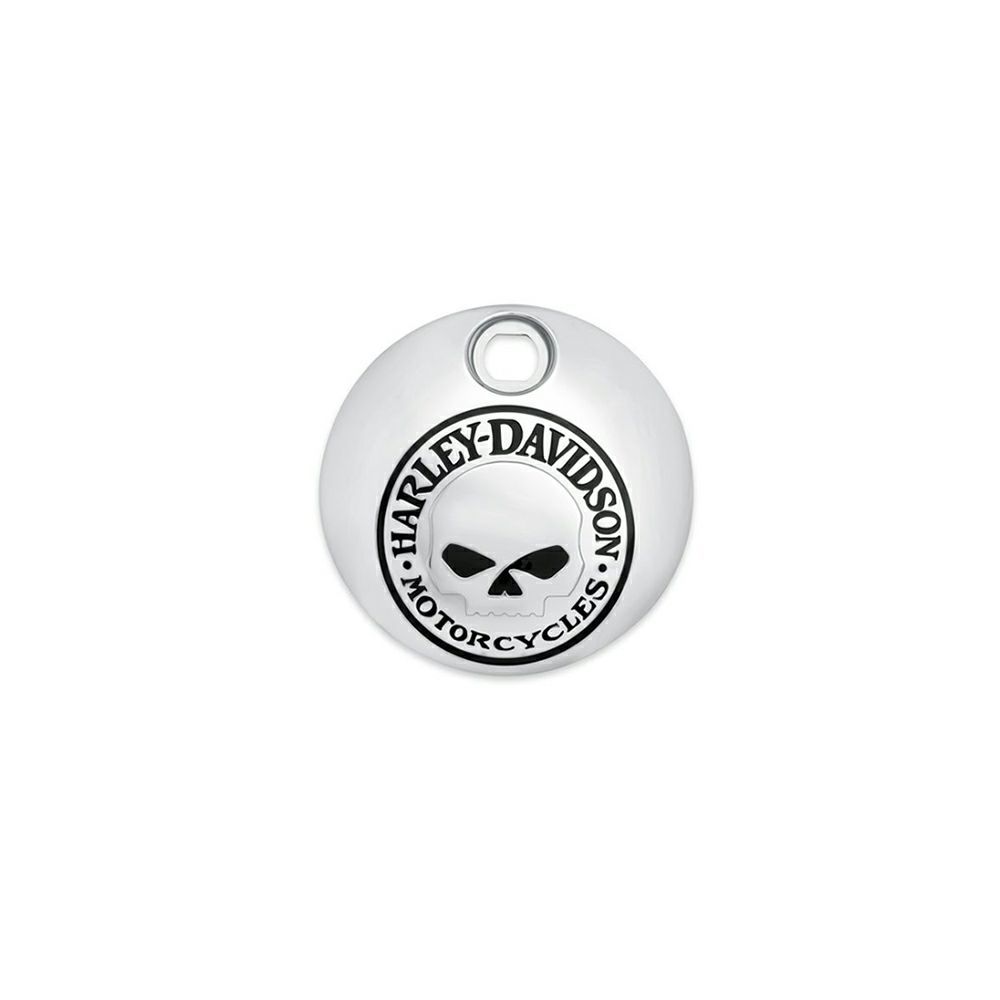 クロームベースにブラックアイ・スカルが映えるデザイン。まわりを取り囲むH-Dスクリプトロゴがインパクトのあるカスタムルックをいっそう強調しています。’08以降エレクトラグライドモデル、ストリートグライドモデル、ウルトラリミテッド、ロードグライドモデル、トライグライドモデルでセンターに給油口があるタンク装備車に適合。
