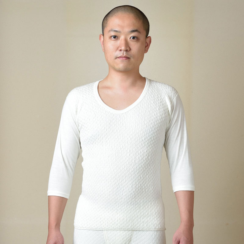 素材 【 キルト部】表側:アクリル37%、指定外繊維(キュートリー™)33%、毛30%中糸:ナイロン100%裏側:ポリ塩化ビニル(ダンロン®)80%、アクリル20%【袖部】表側:アクリル70%、毛30%裏側:ポリ塩化ビニル(ダンロン®)80%、アクリル20% 製造 日本製 洗濯方法 洗濯機(ネット)熱にとても弱い為、熱湯での洗濯、乾燥機、アイロンのご使用はお避けください。 仕様 袖部のみ2重構造 サイズ 胸囲 ウエスト 身長 M 88-96 76-84 165-175 L 96-104 84-94 175-185 LL 104-112 94-104 175-185軽いのに驚異の保温力!1枚の肌着で2枚・3枚分の重ね着効果が実感! エベレスト登山隊が極寒の中、登頂に成功した時に着ていたのが、実はこの「ひだまり」というあまりにも有名な話。 このことにより寒い日は「ひだまり」と誰もが認識したのも事実。 その特徴は、空気層をプラスした独自の3重構造キルトにあります。 暖気をたっぷりとため込んで外へ逃がさず、まるで魔法瓶のよう。しかも、汗などの水分や湿気は素早く放出・発散するのでムレにくく、着心地サラサラ。 汗冷えも防ぎます。 さらに、静電気抑制素材と抗菌消臭素材(共に三菱レイヨン)使用で、嫌なパチパチも、汗臭や体臭も抑えてくれます。 太陽のあたたかさ、独自の三重構造 キルトナイロンを縮ませ、三重構造特殊ウェーブ加工編地(袖部分のみ二重構造)、あたたかい空気はダンロン® で肌側にキープし、冷えの大敵である汗や湿気は毛細管現象で外側へ放出します。 三つの生地の間にできる空気層は、冷気を通さず、体温のぬくもりを蓄えます。 また、この冬嫌なパチパチ感を防ぐ三菱レイヨン 静電気抑制素材「スーパーエレキル」使用、さらに汗臭、加齢臭の原因となるアンモニアなどの4 つの臭気に効果を発揮。 消臭素材「キュートリー」を使用し機能も充実。 保温力が半端ない。極寒でも外仕事が快適です。これぞ、冬を快適に乗り切る「あったか肌着」の決定版!今年の冬は、誰よりも暖かくお過ごしください。 ※こちらの商品は上のみとなります。 紳士肌着ひだまり極(上下)(M-LL)はこちらから 紳士肌着ひだまり極(下)(M-LL)はこちらから