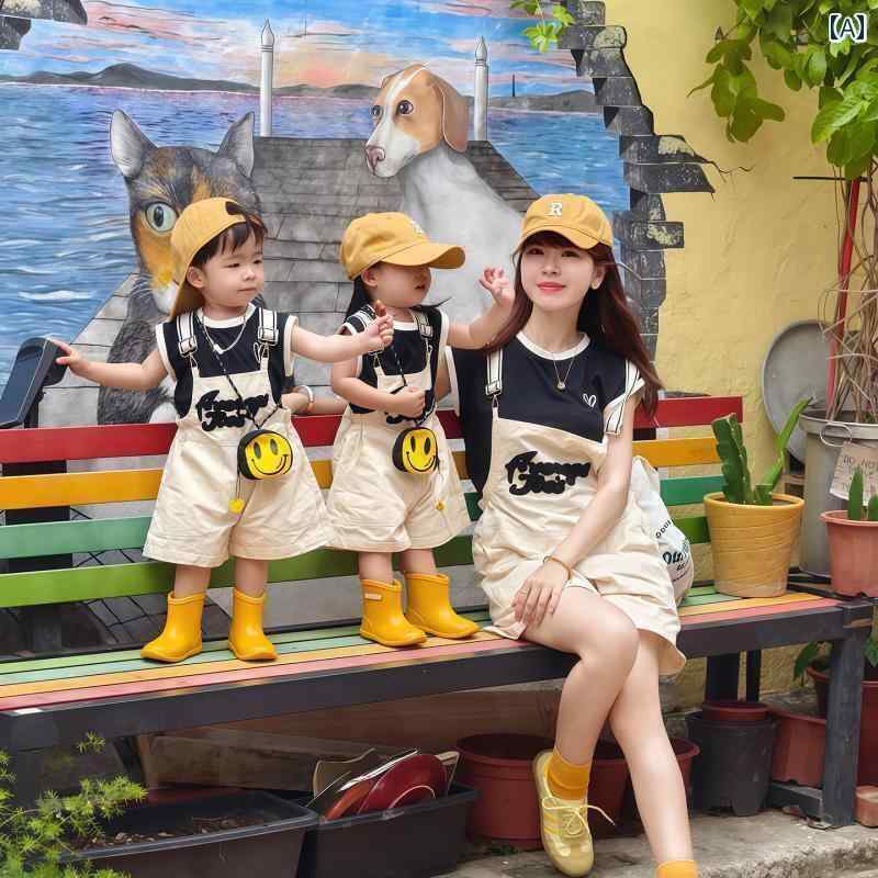 お揃い ファッション コーデ ペアルック カジュアル 親子の 異なる 服装 母 娘 スタイル 2025夏の オーバー オール スーツ ネットの ストリート ブラスト Tシャツ ショート パンツ
