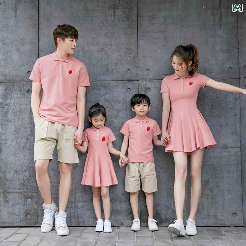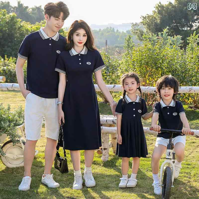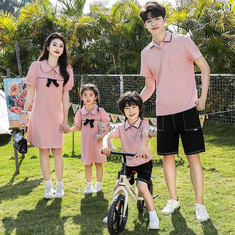 ペアルック 親子 カジュアル コーデ 親子の 服装 夏の 3人 家族または 4人 家族 2025 家族の 母と 子 娘の 洋風 ドレス ポロシャツ