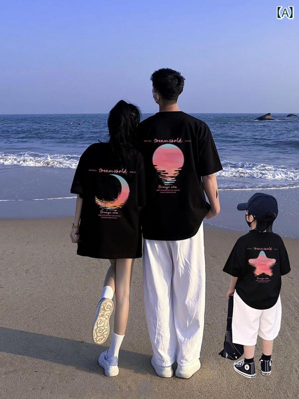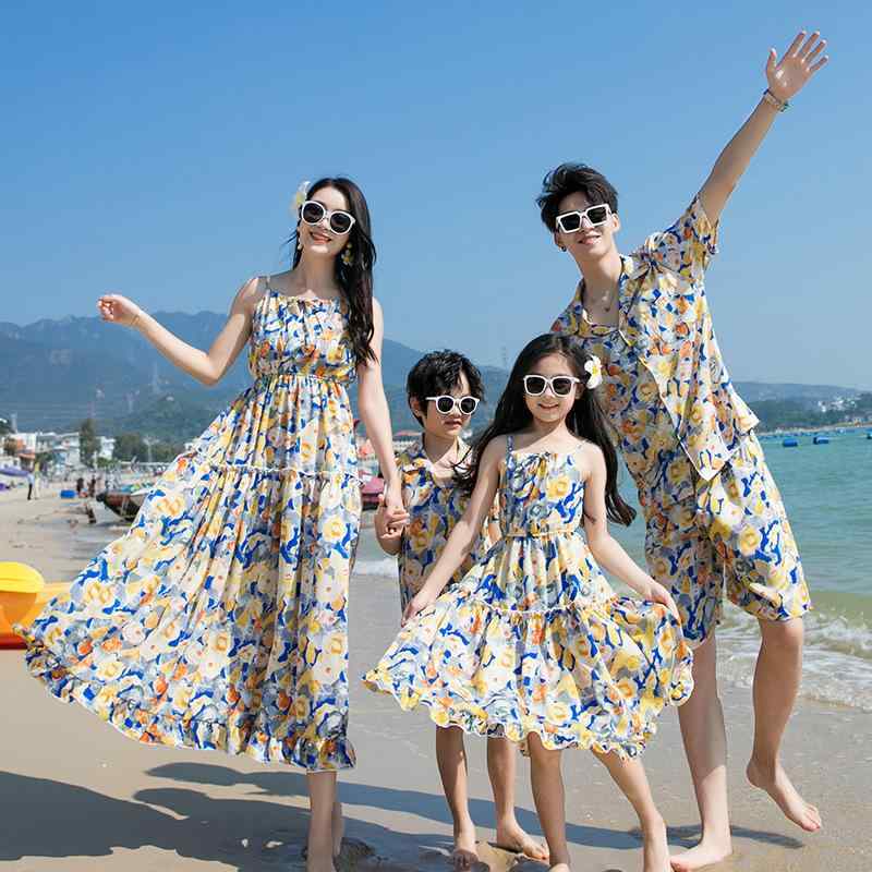 ペアルック 親子 カジュアル コーデ ビーチでの 休暇 三 亜 ビーチの 親子の 服装 ファッション ドレス 3人または 4人の 家族 母と 息子 娘 夏の 半袖