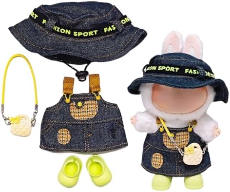 17cmぬいぐるみ用 デニムオーバーオール クロスボディバッグ 靴 帽子 ヘッドフォン 装飾 かわいい コスチューム 着せ替えセット for Labubu 服 1代目 2代目 3代目対応
