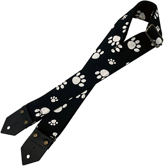 足跡柄の″フットプリント?。一見、定番的なドット柄のような雰囲気にSpiceNoteらしい遊び心を効かせました。犬好きさんネコ好きさんに是非!こちらのシリーズは、ジャガード生地では無くプリント生地を採用。オーソドックスな50mm幅ストラップとして引き立つ柄の選択。それぞれの柄に合わせて生地の取り幅や本体との縫製糸のカラーなどSpiceNoteらしいコダワリを詰め込みました。1枚物の生地から複数裁断し製品化するので同品番同色であっても柄の見せる表情が違うのも特徴です。本体の裏地にはポリプロピレン(PP)の織ベルトを使用。この50mm幅ベルトも張りと厚みを吟味して選択。シッカリとした質感に加えて適度に滑る操作性の高さを両立しています。ストラップエンド部分には本革(ブラック)を採用。バックルを含めた金属類は、高級感とステージでの反射を考慮したアンティック調。ブランドロゴは主張しすぎないようボディエンド側のストラップエンドに型押し加工。幅50mm。全長は820mm〜1450mm。無段階バックル仕様で微調整が可能です。