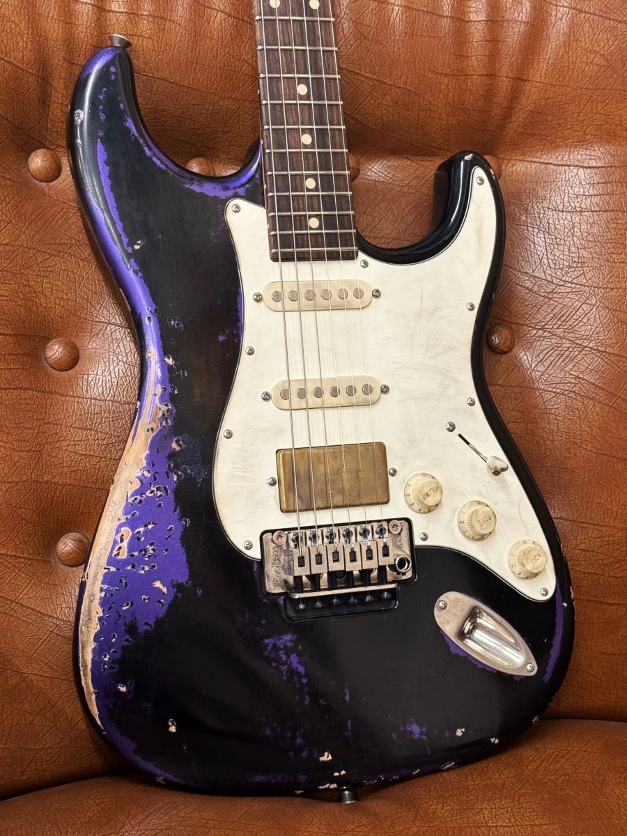 TOM ANDERSON Icon Classic Black over Plumb Crazy (In-Distress Level 3)の中古が入荷しました!! 弊社オーダーのワンオーナー品!! AngelやDrop Topのイメージが強いTom Andersonですが、今回入荷の1本はオーソドックスなストラトスタイルのIcon Classicをベースにしたモデルで、アルダーボディ、ローステッド加工が施されたキャラメルメイプルネックにローズ指板の王道スペックをベースにしており、トムアンダーソンでよく言われる個性のない落ち着いたサウンドとは違い、パンチのある抜群の鳴り感にヴィンテージをも彷彿させる倍音感が魅力で、それでいながらトムアンダーソンらしいバランスの良さを併せ持ったモデルとなっております!! 見た目はあくまでオーソドックスなストラトですが、ブリッジにはロック式のBaby Floydを搭載、ペグにはLocking Tuners、バズフェイトン搭載、トーンポットがそれぞれPush-Pushタイプとなっており、ヴォリュームに近い側のトーンがリアピックアップのタップになっており、一番下側のトーンがセンターポジション時にONにするとセンターピックアップがキャンセルされフロント+リア(スプリット)となりまるでテレキャスターのようなサウンドが可能と、多彩なサウンドメイクとチューニングの安定性、抜群のプレイアビリティを誇る1本となっております!! 重量も3.33kgと大変軽量で長時間のプレイもストレスなく可能!! カラーリングは初のBlack over Plumb Crazyでアンダーにメタリックパープル、トップにブラックカラー、レリックレベルは最大という、アメリカン且つ抜群にカッコいい仕上がりとなっております!! 使用感の少ない美品コンディションで、ネック、電気系統の状態良好、トラスロッドも余裕あり、フレットの減りもほとんど無くお勧め品となっております!! Spec. Body:Alder Neck:Caramel Maple Fingerboard:Rosewood Scale:25 1/2 Inch Frets:22F Heavy Neck Shape:Even-Taper Neck Back Shape Nut Width:1 5/8-inch Pickups: ・Neck SC1 ・Middle SC1 ・Bridge HC2 Tuners:Locking Bridge:Baby Floyd(Recessed Floting Tremolo) Control:5Way,3Knob, Top Jack 3=M,N+B with Split Switching Body Finish:Lacquer Neck Finish:Natural Satin Strings:10-46 重量:3.33kg 付属品:オリジナルハードケース、アーム、レンチ一式、新品時保証書 製造年:2023年製 ※正規輸入品 ※掲載商品売却時に在庫表示につきましては迅速な対応を心掛けておりますが、タイムラグが発生する場合がございます。予めご了承下さい。 ※モニター等につきまして色合いが異なる場合がございますので予めご了承下さい。