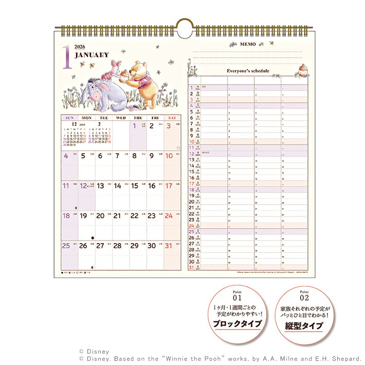 ディズニー くまのプーさん 2026年 家族Wマンスリー 壁掛けカレンダー 1000136996 [disneyzone]