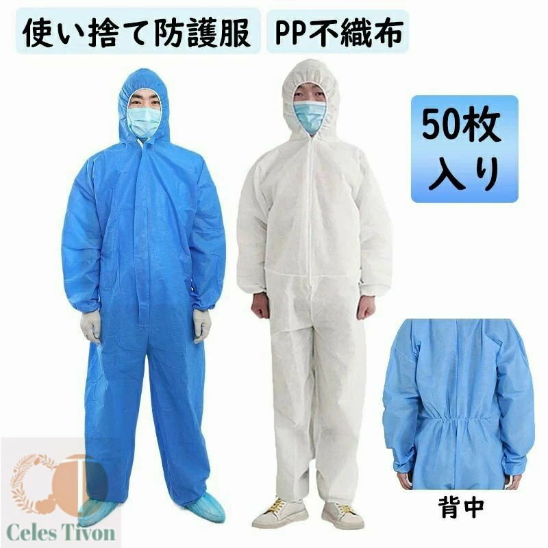 送料無料 「50枚入り」高品質 厚みのあるモデル 防護服 使い捨て 保護服 作業服 PP不織布 衛生 食品加工 飛沫 ウィルス対策 帽子付き 防塵 汚れ防止 静電気防止 ワークウエア 上下一体型 男女兼用 病院 塗装 倉庫作業 園芸用 大きいサイズ