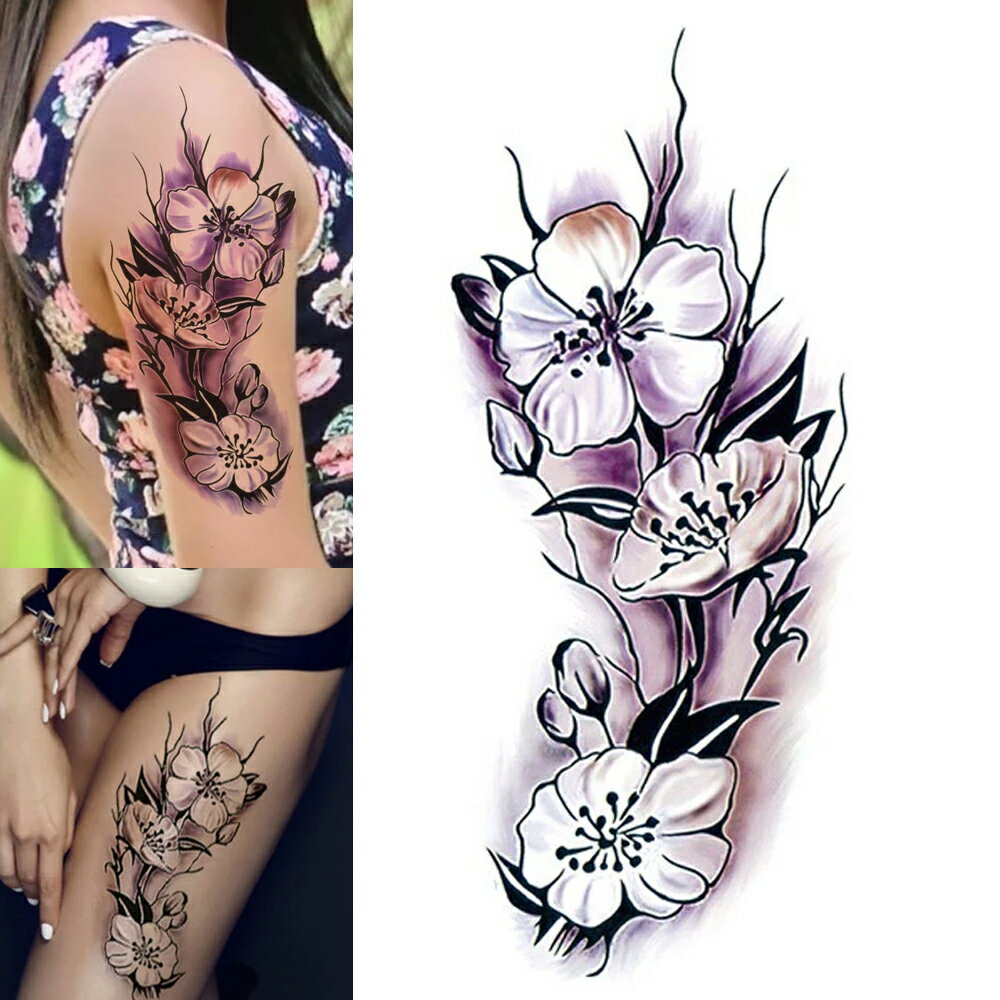 大きめフェイクタトゥーステッカー 1シート 花 フラワー パープル ホワイト サクラ 桜 タトゥシール メンズ レディース 仮装 変装 入れ墨 小道具 衣装 映画 ドラマ テレビ 撮影 コスプレ 大きい 胸 肩 背中 お腹 太腿 足首 腰 太もも 黒色 刺青 偽物