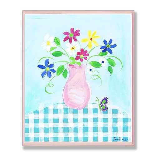 Stupell のキッズルーム、ブルーギンガムテーブルクロスに花と蝶のピンクの花瓶、長方形の壁プラーク Stupell Industries The Kids Room by Stupell Pink Vase with F and Butterflies on Blue Gingham Tablecloth Rectangle Wall Plaque