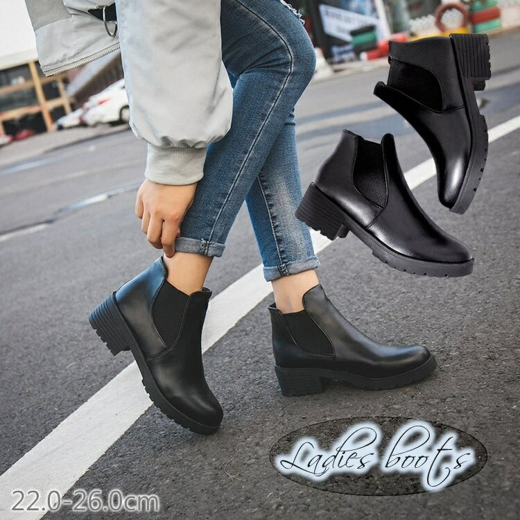 送料無料 ショートブーツ サイドゴア レディース 靴 タンクソール チャンキーヒール 太ヒール ブラック PUレザー ラウンドトゥ ヒール高 4.5cm カジュアル