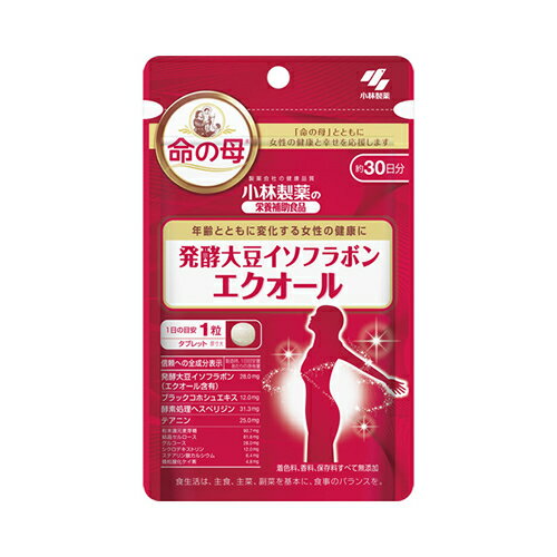 *パッケージは予告なく変更されることがあります 商品説明 「小林製薬の栄養補助食品 命の母 発酵大豆イソフラボン エクオール 30粒」は、発酵大豆イソフラボン(エクオール含有)配合、年齢とともに変化する女性の健康を応援する栄養補助食品です。 健康成分「大豆イソフラボン」は、おなかの中で腸内細菌「エクオール」という成分になることで、そのパワーを発揮します。この「エクオール」を体内で作れるのは日本人の約2人に1人といわれており、「エクオール」を直接摂ることをおすすめします。本品は、1粒あたりエクオール2.0mg含んでいます。 お召し上がり方 栄養補助食品として1日1粒を目安に、かまずに水またはお湯とともにお召し上がりください。 ●短期間に大量に摂ることは避けてください。 使用上の注意 ●乳幼児・小児の手の届かないところに置いてください。 ●乳幼児・小児には与えないでください。 ●妊娠・授乳中の方は摂らないでください。 ●薬を服用中、通院中の方及び肝機能検査で異常のある方は医師にご相談ください。 ●食品アレルギーの方は全成分表示をご確認の上、お召し上がりください。 ●体質体調により、まれに体に合わない場合(発疹・胃部不快感など)があります。その際は使用を中止してください。 ●天然由来の原料を使用のため、色等が変化することがありますが、品質に問題はありません。 保存方法 直射日光を避け、湿気の少ない涼しい所に保存してください。 原材料名・栄養成分等 ●名称:エクオール含有大豆胚芽抽出発酵物・ブラックコホシュエキス配合食品 ●原材料名:粉末還元麦芽糖、大豆胚芽抽出発酵物、グルコース、ブラックコホシュエキス、結晶セルロース、酵素処理ヘスペリジン、テアニン、シクロデキストリン、ステアリン酸、カルシウム、微粒酸化ケイ素 ●栄養成分表示/1日目安量(1粒)あたり:エネルギー 0.72kcal、たんぱく質 0.041g、脂質 0.0083g、糖質 0.17g、食物繊維 0.083g、ナトリウム 0.0039-0.39mg、カルシウム 0.086-0.86mg エクオール 2.0mg、テアニン 25.0mg 原産国 日本 お問い合わせ先 お客様相談室 フリーダイヤル:0120-5884-02 販売者 小林製薬株式会社 大阪市中央区道修町4-4-10 文責:(有)古市健康薬局 登録販売者 辻村安司 広告文責: (有)古市健康薬局 TEL 072-956-4113