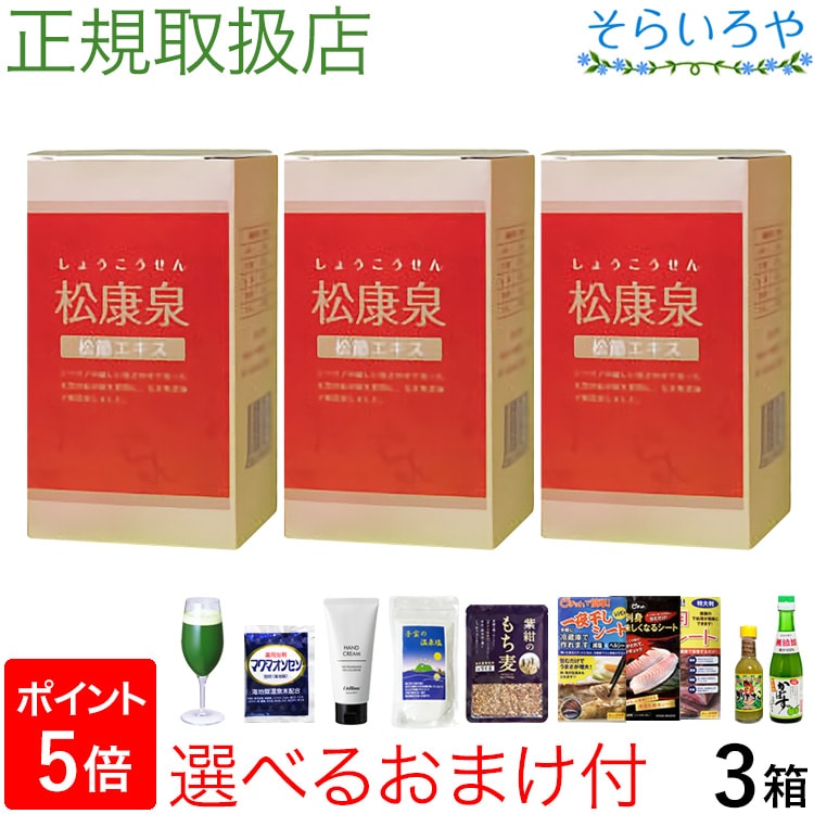 ■松康泉(しょうこうせん) 3箱セット 原材料:松こぶ、柳葉、スッポン、ゼラチン( カプセル:ゼラチン) ※日本食品衛生法に従い製造し、輸入の際に公的機関から国内製造よりも厳しい検査を受けています。 内容量:100粒 お召し上がり方:1日3〜9粒を目安に水などでお召し上がり下さい。添加物は使用しておりませんので開封後はふたをしっかり閉め、早めにお召し上がり下さい。 メーカー:株式会社徳潤(お問い合わせ:078-954-8820) 区分:中国製・健康食品 広告文責:有限会社大田薬品(0120-925-342) 当店は、株式会社徳潤の商品、ショウキT-1の正規取扱店です。 健康・ダイエット・健康食品・サプリメント・美容などお気軽にご相談ください。※転売目的または大量購入と判断した場合、ご注文をキャンセルすることがあります。 ■松康泉(しょうこうせん)100粒 3箱セット 松の自然治癒成分を豊富に含んだ松節は、通称を松瘤(まつこぶ)といい、松の木自身が害虫や外傷による傷を治すために松の成分(ピネシアコムオイル)が集中して出来たものです。ピネシアコムオイルにはポリフェノールや精油成分など、多くの注目成分が含まれています。 選べる特典付き