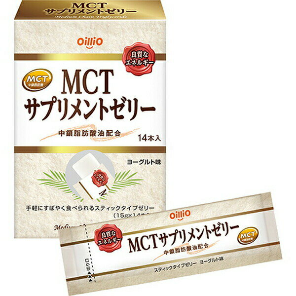 "■製品特徴手軽にすばやく食べられるスティックタイプゼリー。本商品はMCT(中鎖脂肪酸油)を1本あたり6g配合している。毎日、手軽にMCT(中鎖脂肪酸油)を補給することで、体づくりをサポート。■内容量210g(15g×14本)■原材料MCT(中鎖脂肪酸油)、砂糖、食塩/乳化剤、ゲル化剤(増粘多糖類)、酸味料、香料、甘味料(スクラロース)、調味料(アミノ酸)■栄養成分表示熱量 60kcal、たんぱく質 0g、脂質 6.2g、炭水化物 1.1g、食塩相当量 0.02g、中鎖脂肪酸油 6g、■使用方法ノッチ(切り口)を切って開封してください。■注意事項●色や硬さにバラツキがある場合があるが、品質に問題はない。●本品は、1回に召し上がる量が多いとお腹がゆるくなることがある。初めて召し上がる場合は1本から徐々に増やすようにする。●開封時には液がはねることがあるのでご注意いただきたい。●お召し上がりの際は、よく噛んで、のどに詰まらせないようご注意を。●体に合わない時はご使用を中止する。●袋から直接召し上がる場合は、切り口や袋の端で口や手を傷つけないようご注意するように。【お問い合わせ先】こちらの商品につきましての質問や相談は、当店(ドラッグピュア)または下記へお願いします。日清オイリオ〒104-8285 東京都中央区新川一丁目23番1号電話:0120-016-0249:00〜17:00(土・日・祝日・弊社休日を除く) 2020年6月8日より当面の間、受付時間を10:00〜16:00に短縮しております。広告文責:株式会社ドラッグピュア作成:202008YK神戸市北区鈴蘭台北町1丁目1-11-103TEL:0120-093-849製造販売:日清オイリオ区分:食品・日本製文責:登録販売者 松田誠司■ 関連商品サプリメントゼリー関連商品日清オイリオお取り扱い商品"