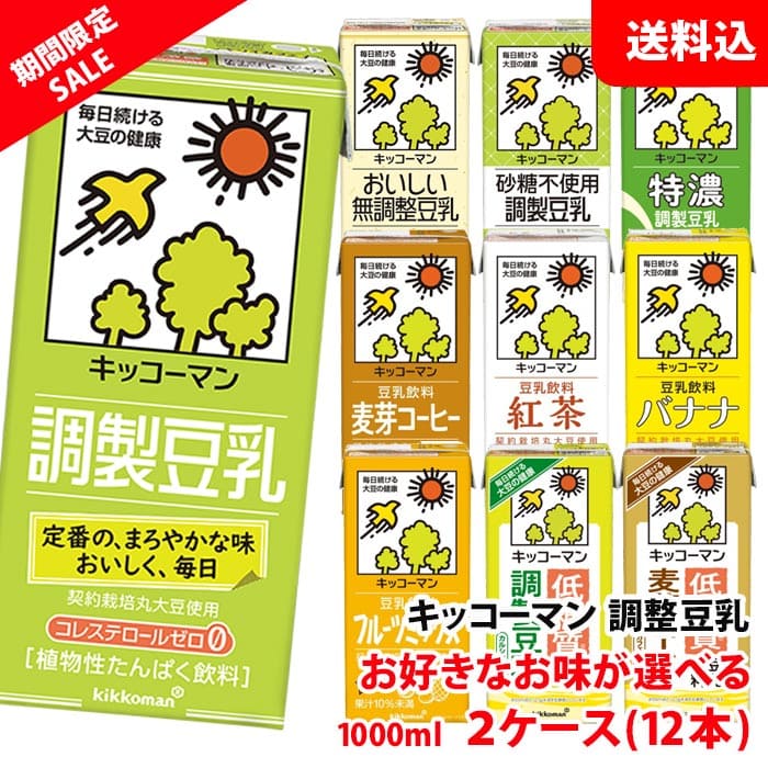 内容量 1000ml 賞味期限 製造日より180日 ※開封後はお早めにお飲みください 保存方法 常温で保管可 高温多湿は避けてください。 商品説明 キッコーマンの豆乳が自由に選べる。 ・おいしい無調整豆乳1000ml ・調製豆乳1000ml ・特濃調製豆乳1000ml ・豆乳飲料 麦芽コーヒー1000ml ・豆乳飲料 紅茶1000ml ・豆乳飲料 バナナ1000ml ・豆乳飲料 フルーツミックス1000ml ・低糖質・調整豆乳1000ml ・低糖質・豆乳飲料麦芽コーヒー1000ml ・調整豆乳砂糖不使用1000ml お好きな豆乳をお選びください。キッコーマンのお好きな豆乳がケース単位で選べて送料無料!! こちらの商品は2ケース(12本)でのご注文になります。 九州地区・北海道は500円、沖縄は800円の送料で発送します!! ※商品パッケージはキャンペーン及びリニューアルなどで予告無しに変更となる場合がございます。