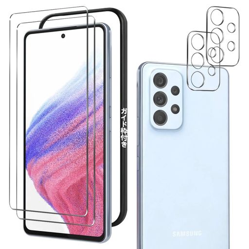 【2+2枚セッ】GALAXY A53 5G SCG15 SC-53C 用のフィルムギャラクシー A53 用のカメラフィルム【HUY】GALAXY A53 用の 液晶保護フィルム 【ガイド枠付き】 強化ガラス フィルム 硬度9H 超薄 2.5D 耐衝撃