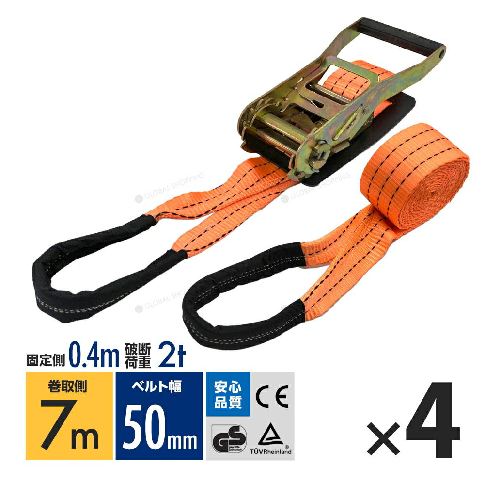 ラッシングベルト ワッカ トラック用 幅 50mm ラチェットベルト ラチェット式 ラチェット バンド ベルト ロープ 固定 荷物 荷物固定 荷台 固定側0.4m 巻側7m 破断荷重2000kg ラチェット式 タイダウンベルト 4本set 1年保証