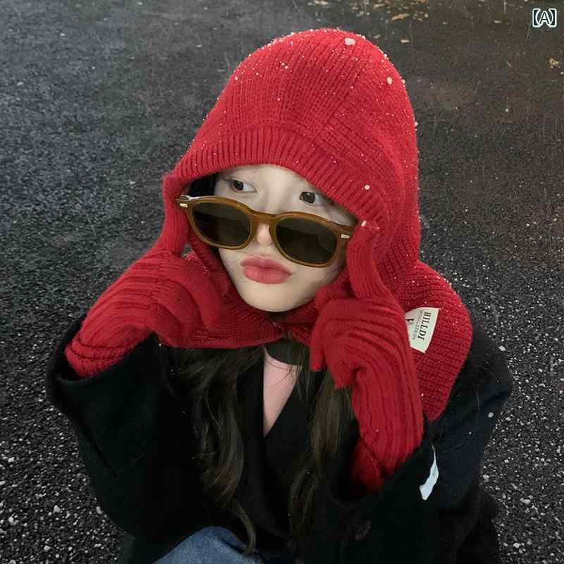 バラクラバ おしゃれ 帽子 女子 ウィニー リー バラクラバ ハット グローブ 秋冬 レディース レッド 暖かい ニット ウール 新年 スカーフ
