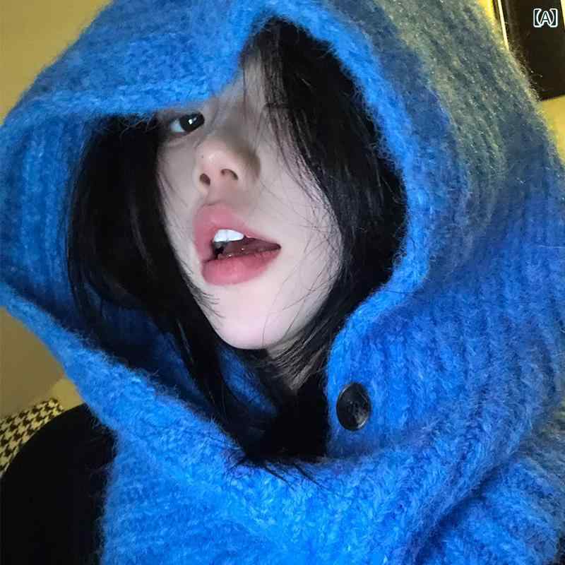 バラクラバ おしゃれ 帽子 女子 Licheng 北欧 アイスランド ブルー サークル ミックス カラー ヤーン ニットプルオーバー 帽子 レディース 冬 バラクラバ スカーフ 一 体型