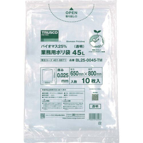 TRUSCO バイオマス25%業務用ポリ袋0.025X45L(透明)10枚入 BL25-0045-TM