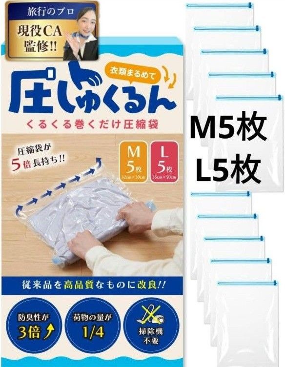 圧縮袋 旅行 衣類圧縮袋 【5倍長持ちに改良】 圧しゅくるん トラベルグッズ 真空 圧縮 出張 修学旅行 家族旅行 [Danke Besutens] (迷わず旅セット(M5枚/L5枚))