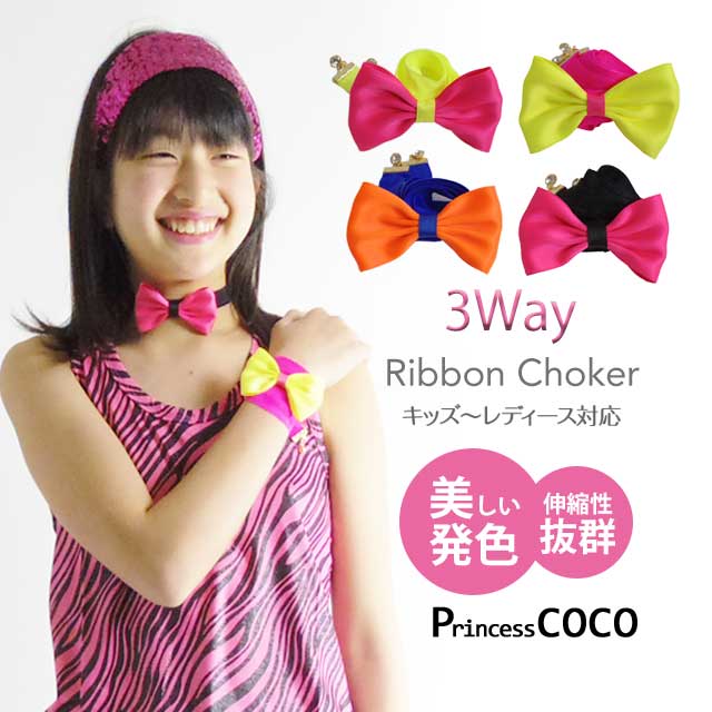 キッズ ダンス衣装 チョーカー ダンス アクセサリー 3Way リボン EAKN-04[子供 ジュニア ガールズ レディース フリーサイズ 衣装 ダンス小物 黒 蛍光カラー 蛍光 ピンク 黄色 ブルー 発表会 ステージ衣装 韓国]
